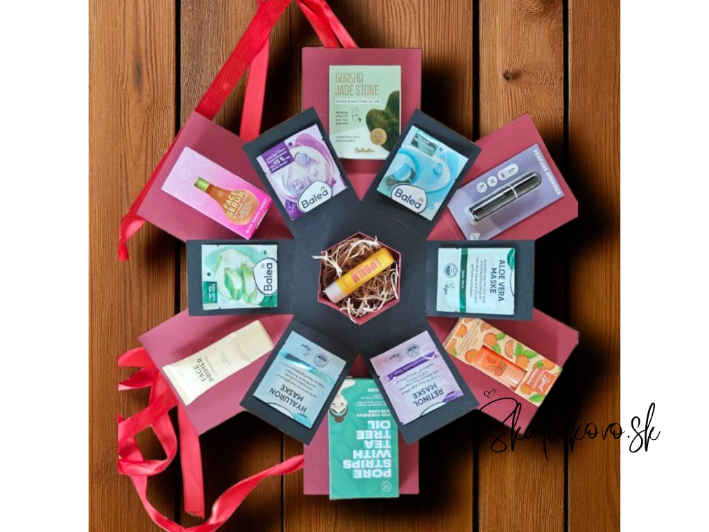Darčeková škatuľka zo Škatulková je originálny spôsob, ako obdarovať ženu niečím praktickým, milým a prekvapivým zároveň. Vo vnútri sa nachádza 13 kusov starostlivo vybraných mini produktov, ktoré sa líšia obsahom – každá škatuľka je preto unikátna. Produkty sú zamerané na starostlivosť o pleť, pery a relaxáciu, nájdete medzi nimi rôzne druhy masiek, balzamy na pery, pleťové krémy či ďalšie drobné kozmetické vychytávky.